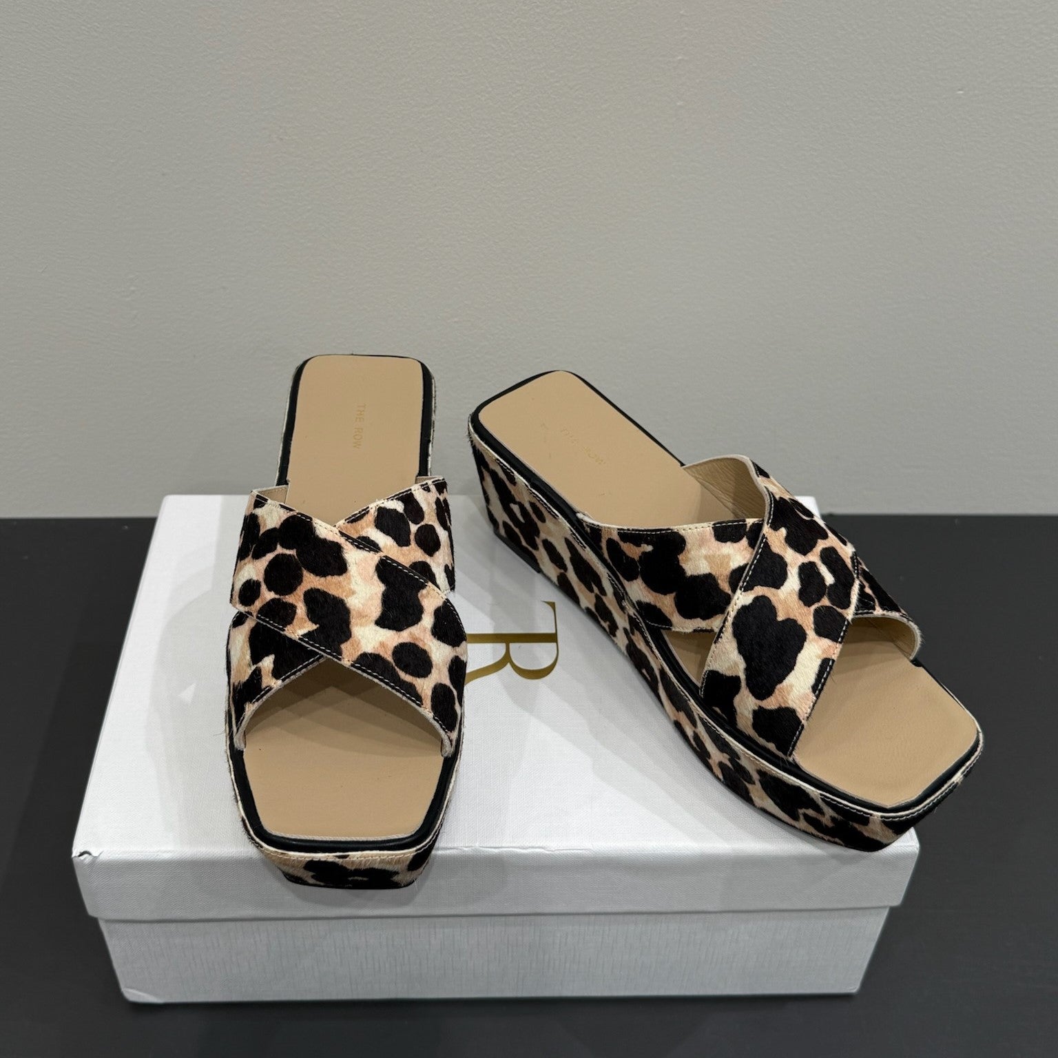 The Row Thick-soled Cross-strap Sandals 6cm Black Leopard Print Horsehair 337446