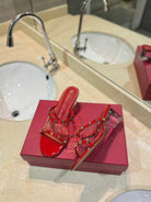 ROCKSTUD MULE SANDALS IN CHERRY RED CALFSKIN AND TRANSPARENT PVC FILM