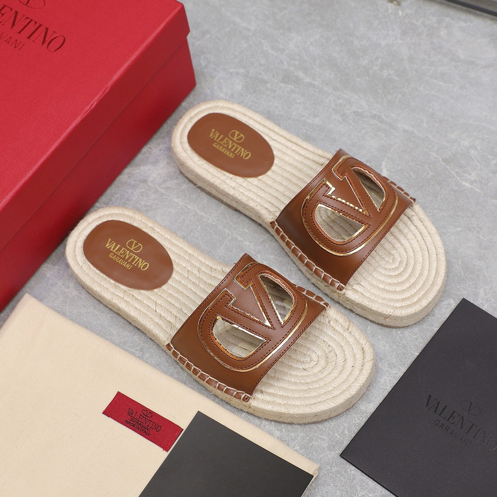 Vlogo Cut-Out Slide 20 Tan Calfskin Beige Sole Raffia
