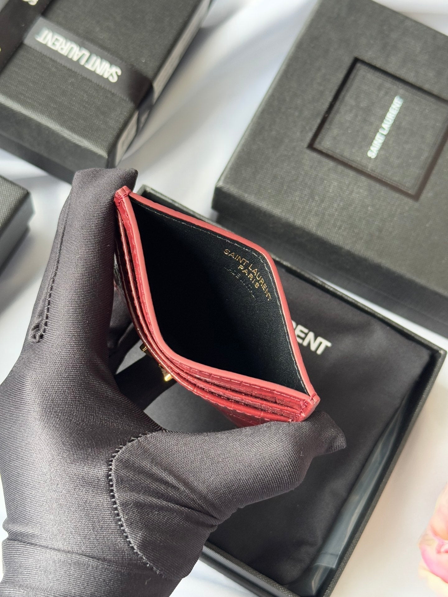 YSL Card Holder 10cm Wallet Burgundy Gold Crocodile Leather 240559