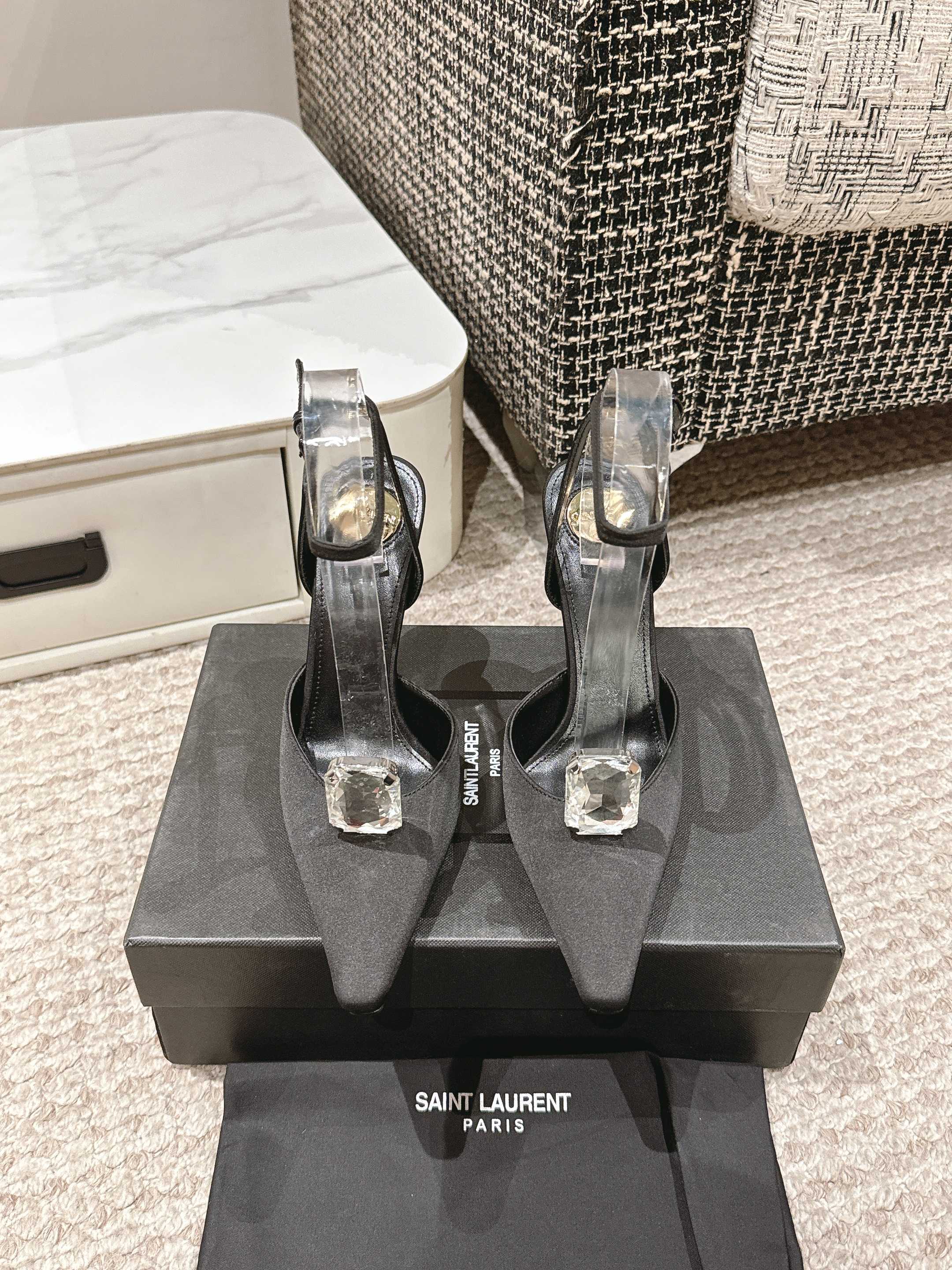 AIMÉE HIGH 75 MM SLINGBACK PUMPS IN BLACK SATIN WITH CRYSTAL