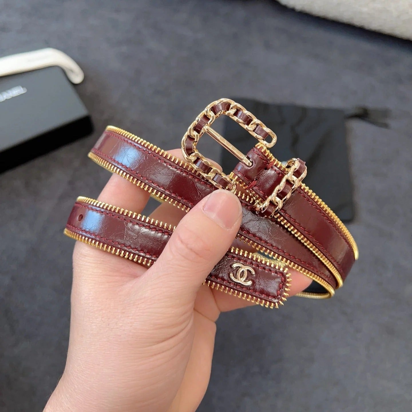 BELT 20MM IN WINE RED CALFSKIN WITH INTERWOVEN CHAIN BUCKLE ZIPPER IN TRIM GOLD HARDWARE