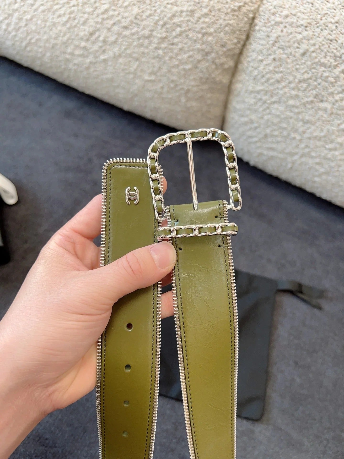 BELT 40MM IN OLIVE GREEN CALFSKIN WITH INTERWOVEN CHAIN BUCKLE ZIPPER IN TRIM SILVER HARDWARE