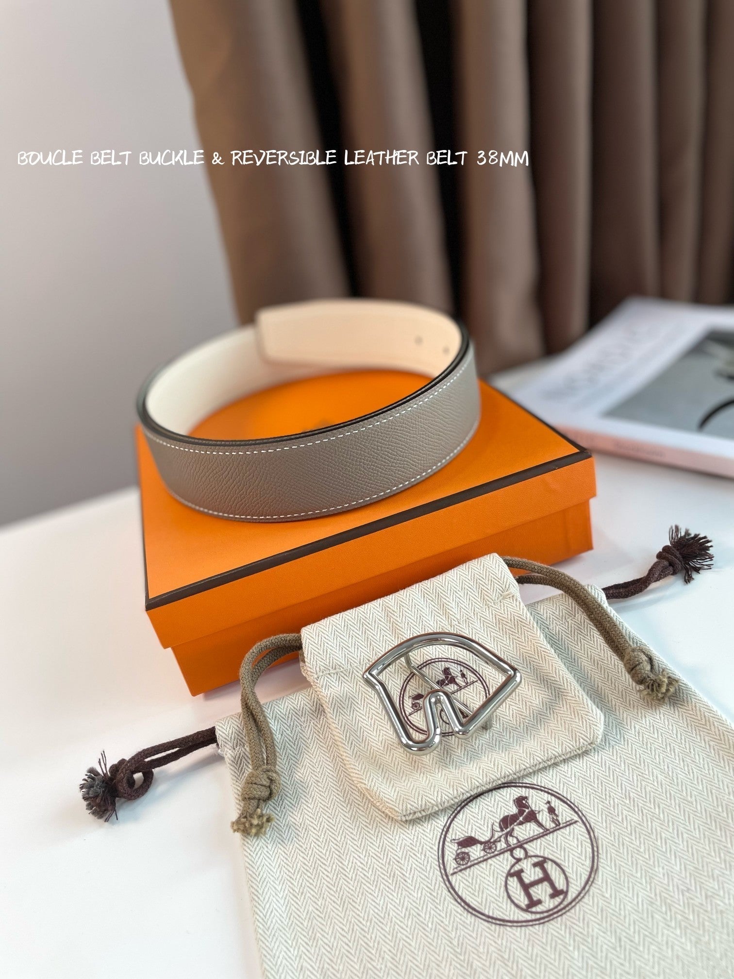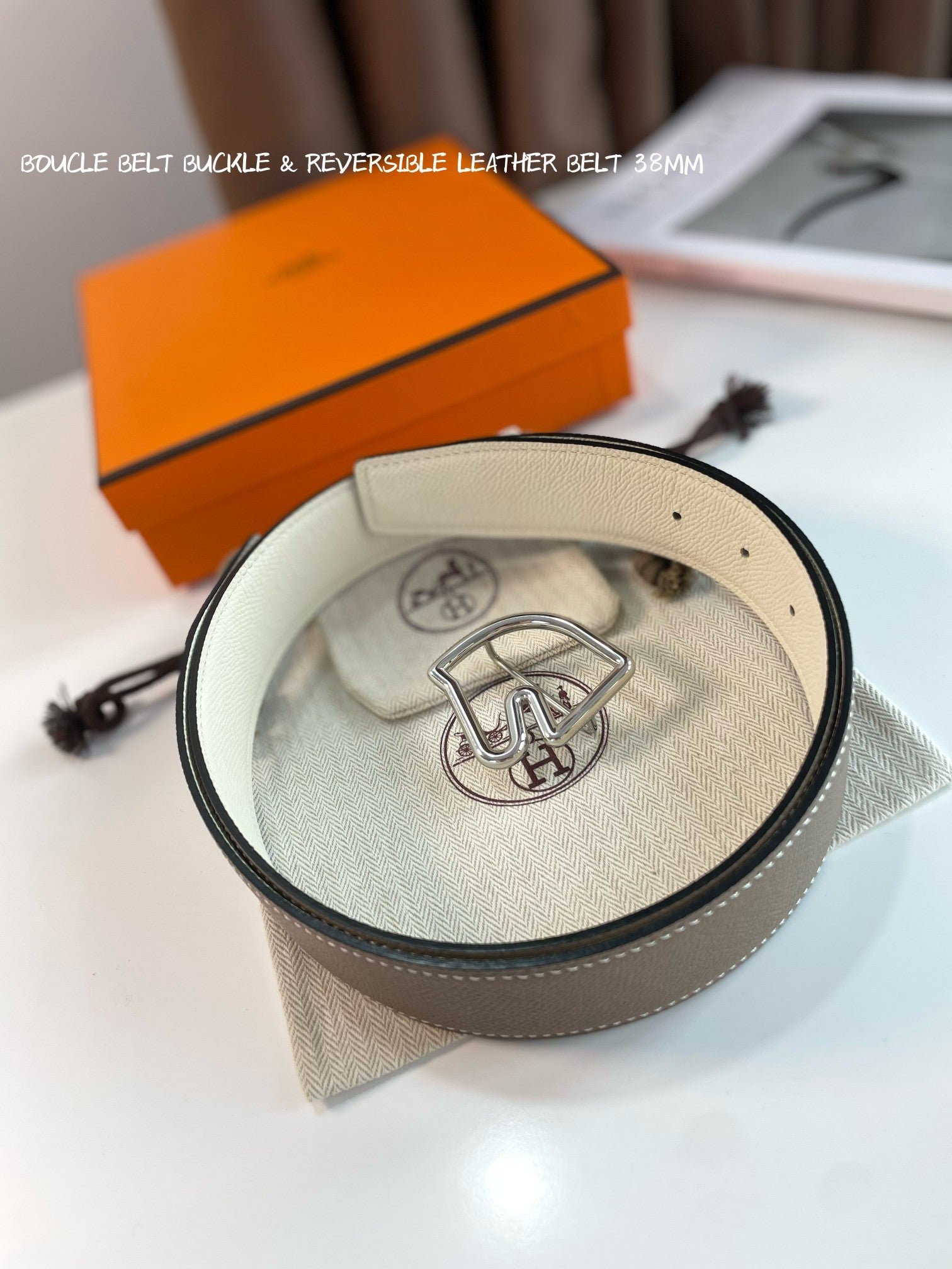 BOUCLE BELT BUCKLE & REVERSIBLE KHAKI BROWN AND WHITE LEATHER STRAP 38MM SILVER HARDWARE