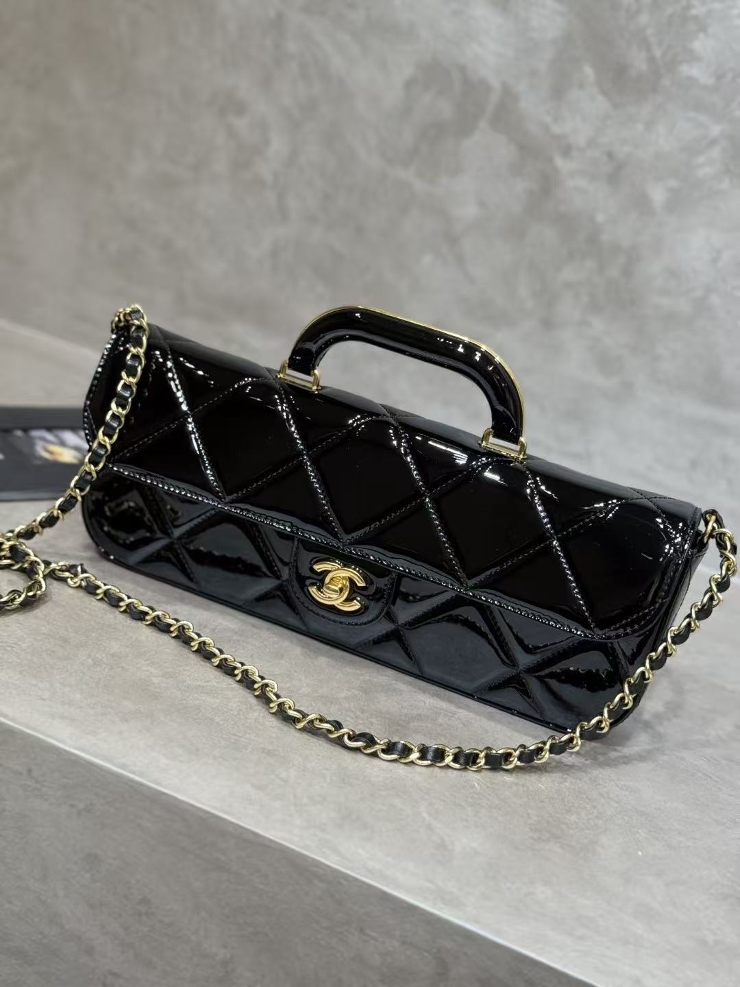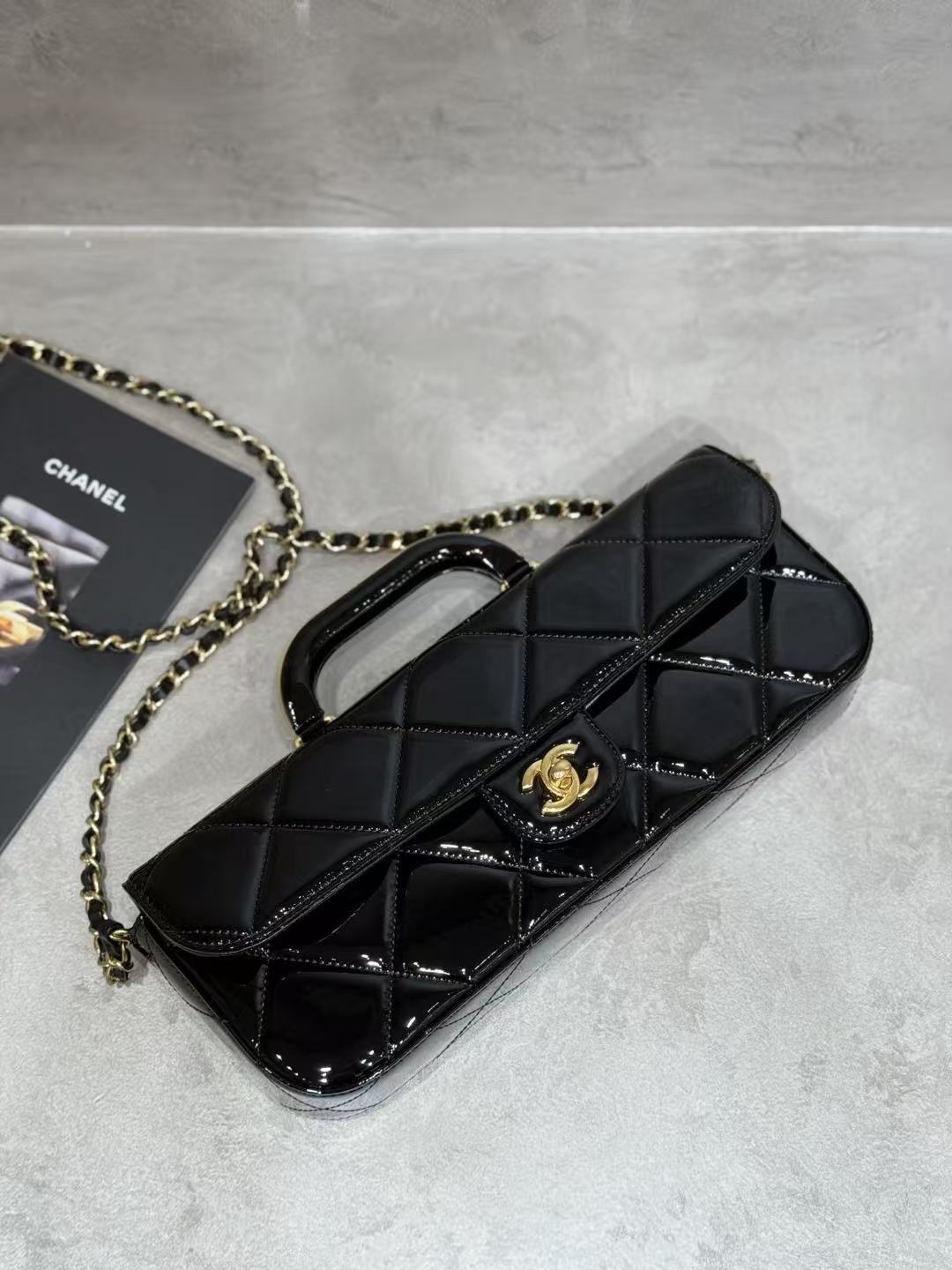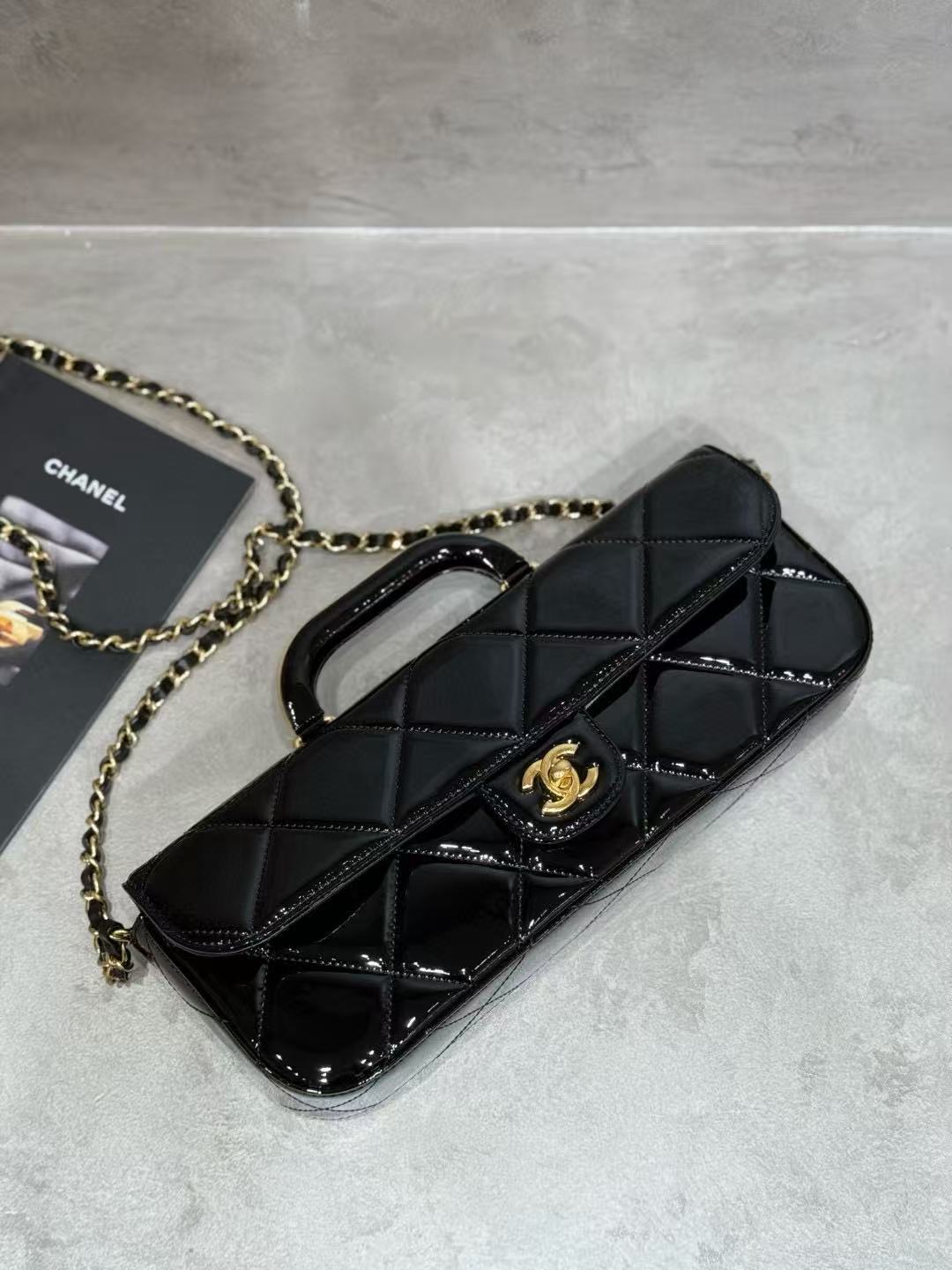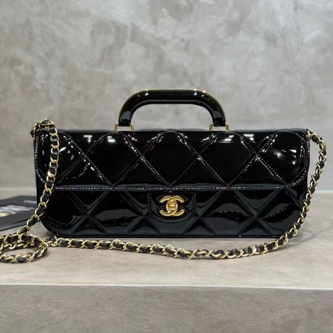 CC 25K Large Flap Bag with Top Handle Chain Strap Black Patent Calfskin GHW