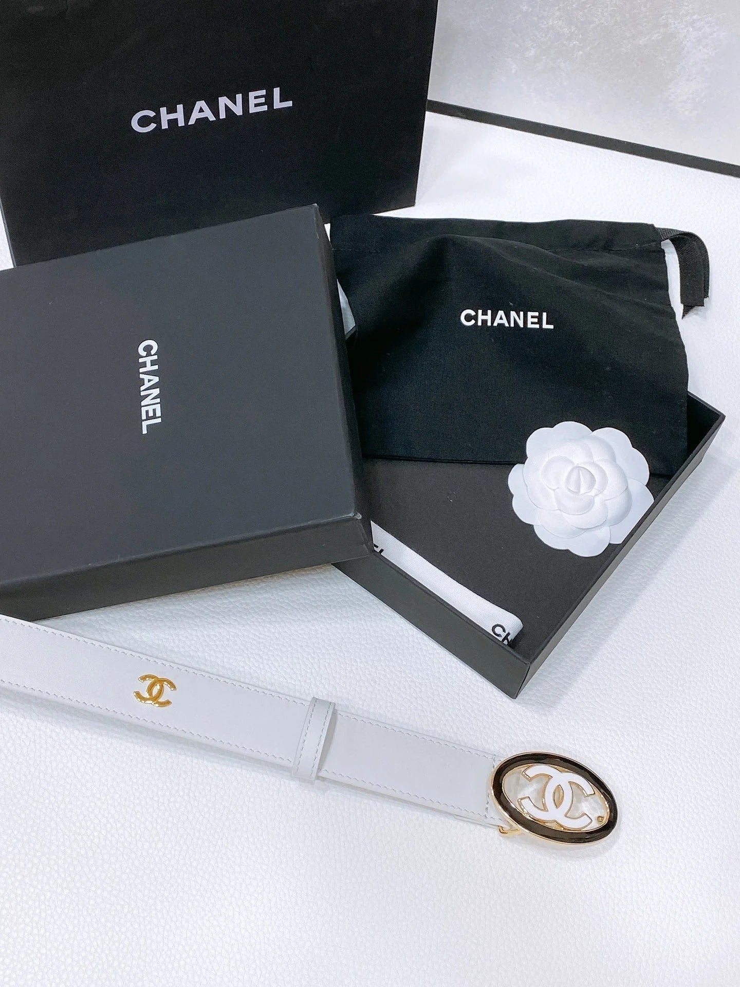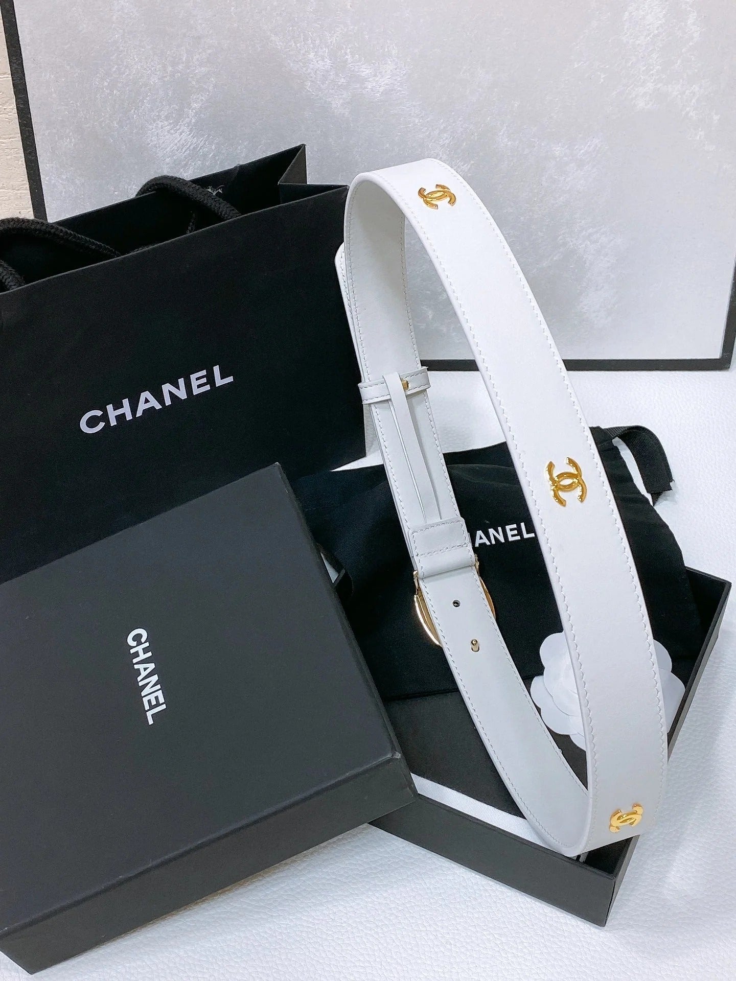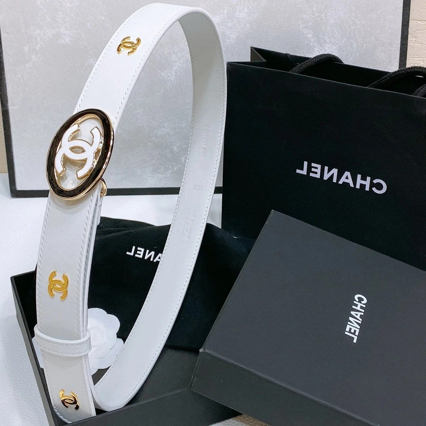 CC 30MM BELT IN WHITE SMOOTH CALFSKIN WHITE MIX BLACK METAL LOGO GOLD HARDWARE