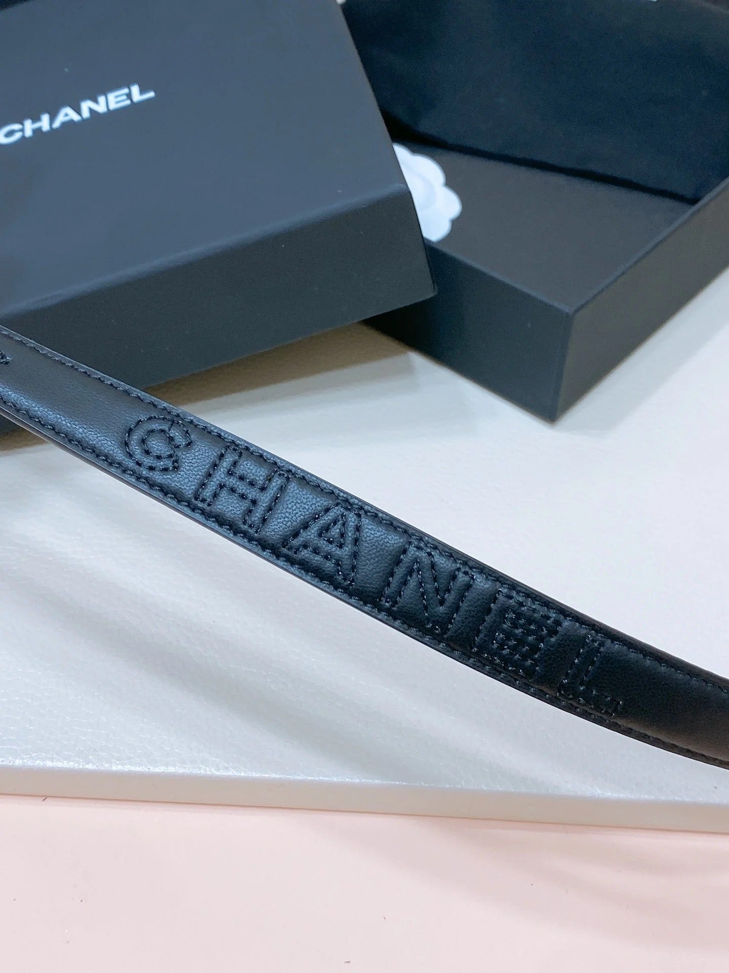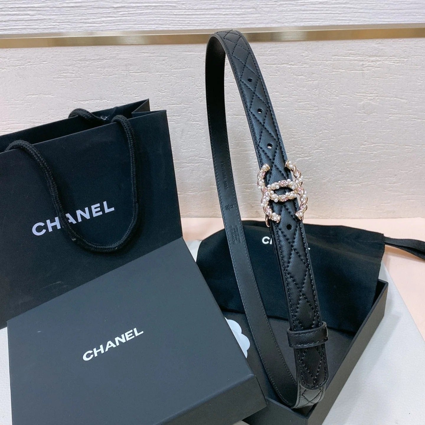 CC BELT 20MM IN BLACK EMBROIDERED CALFSKIN GOLD HARDWARE ATTACH PEARLS
