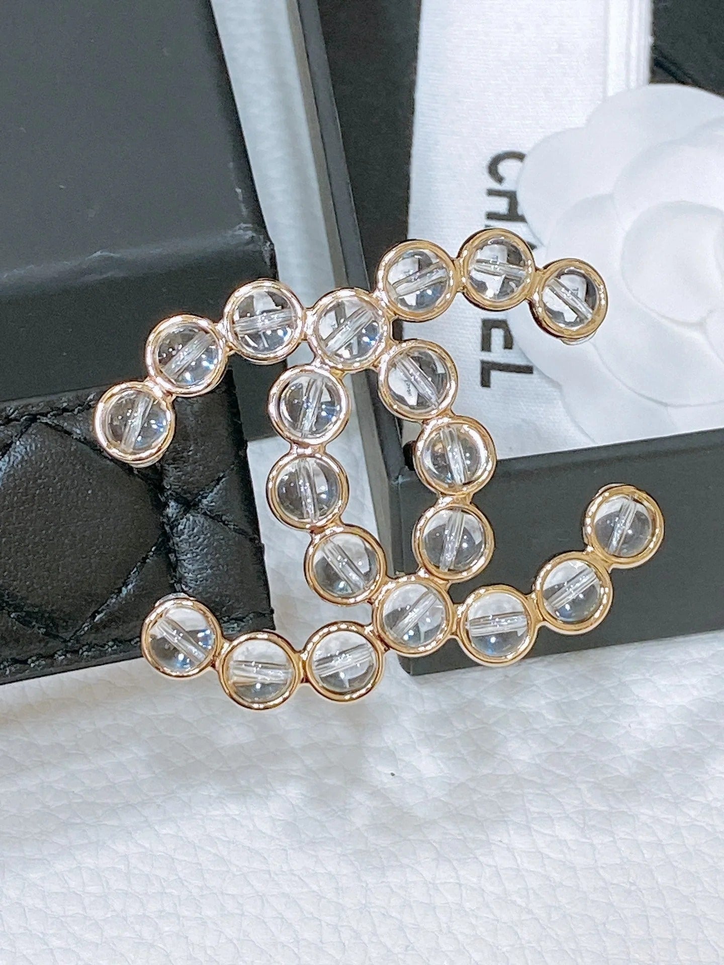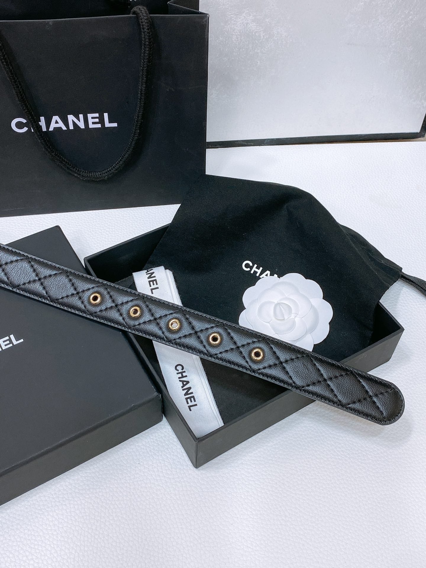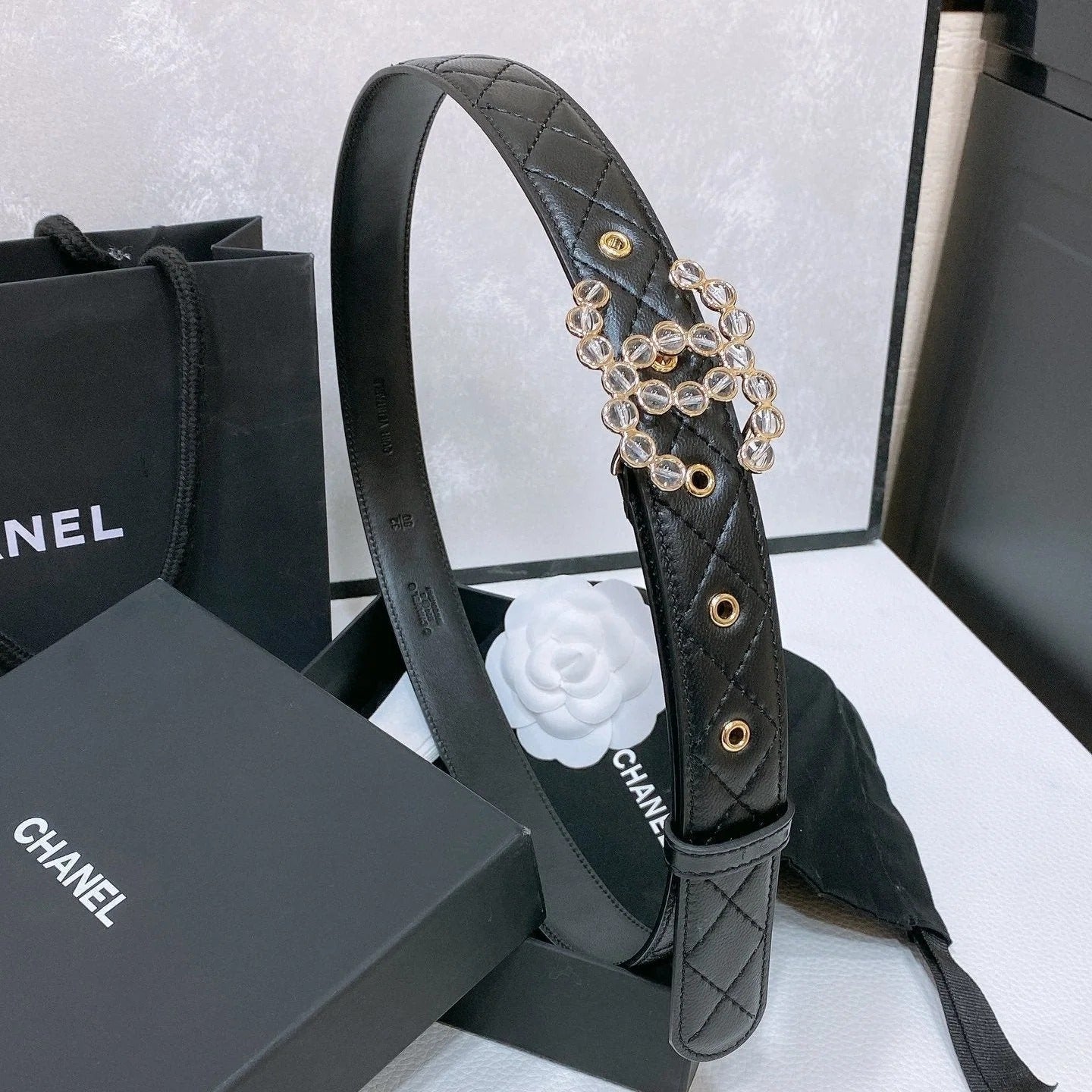 CC BELT 30 MM IN BLACK EMBROIDERED CALFSKIN PEARL LOGO WITH GOLD HARDWARE