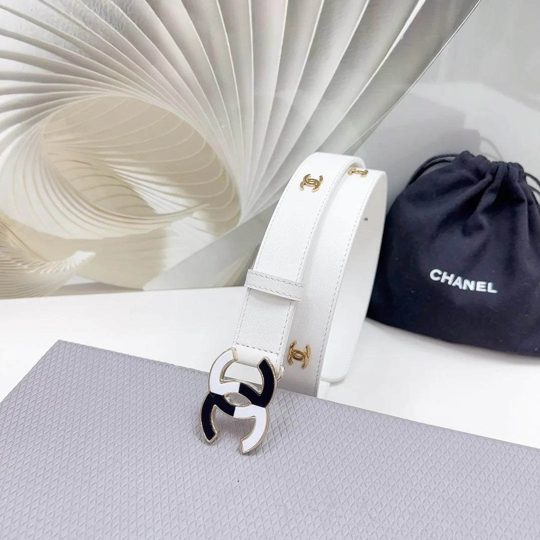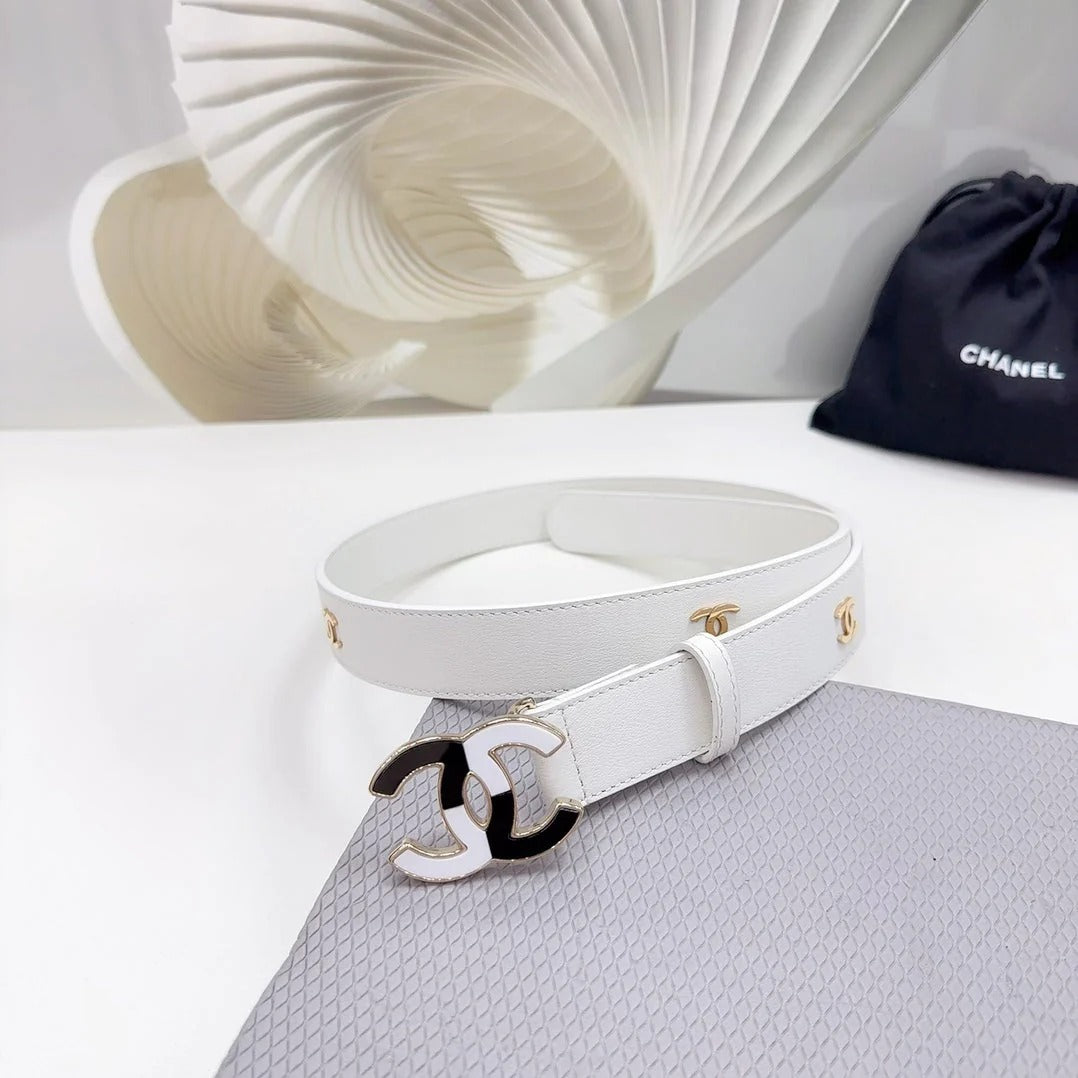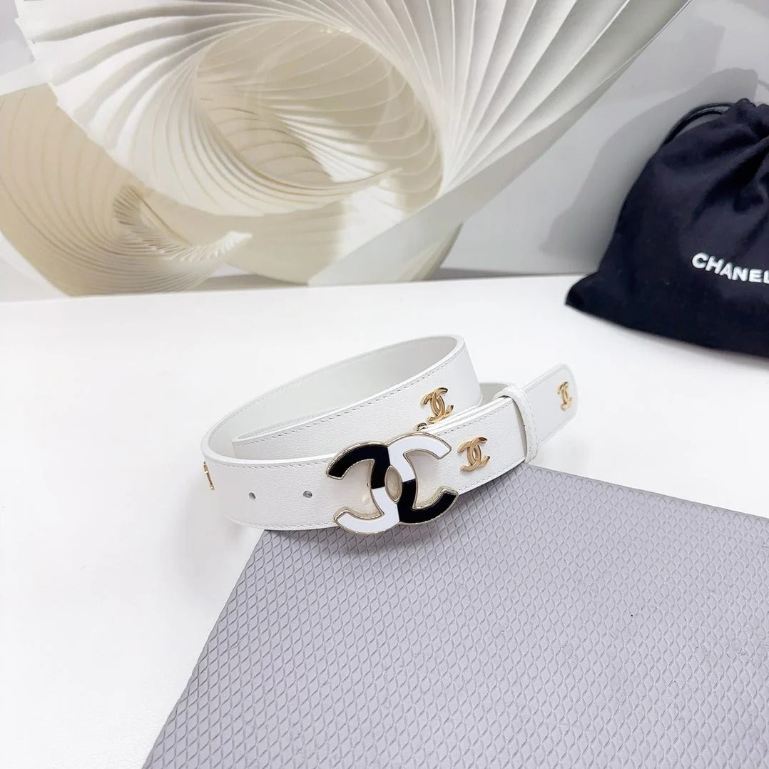 CC BELT 30 MM WHITE CALFSKIN GOLD HARDWARE WITH WHITE MIX BLACK LOGO