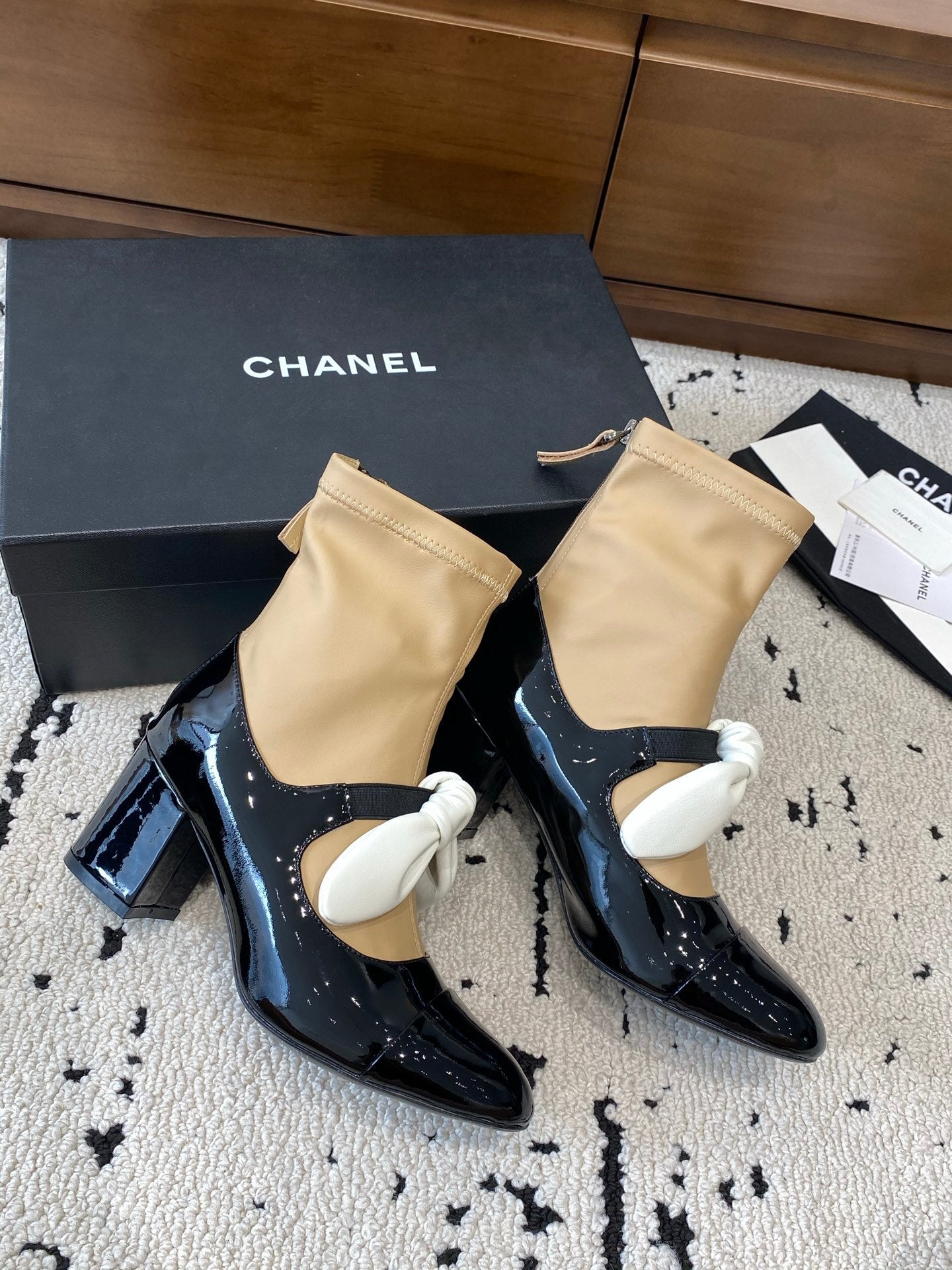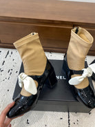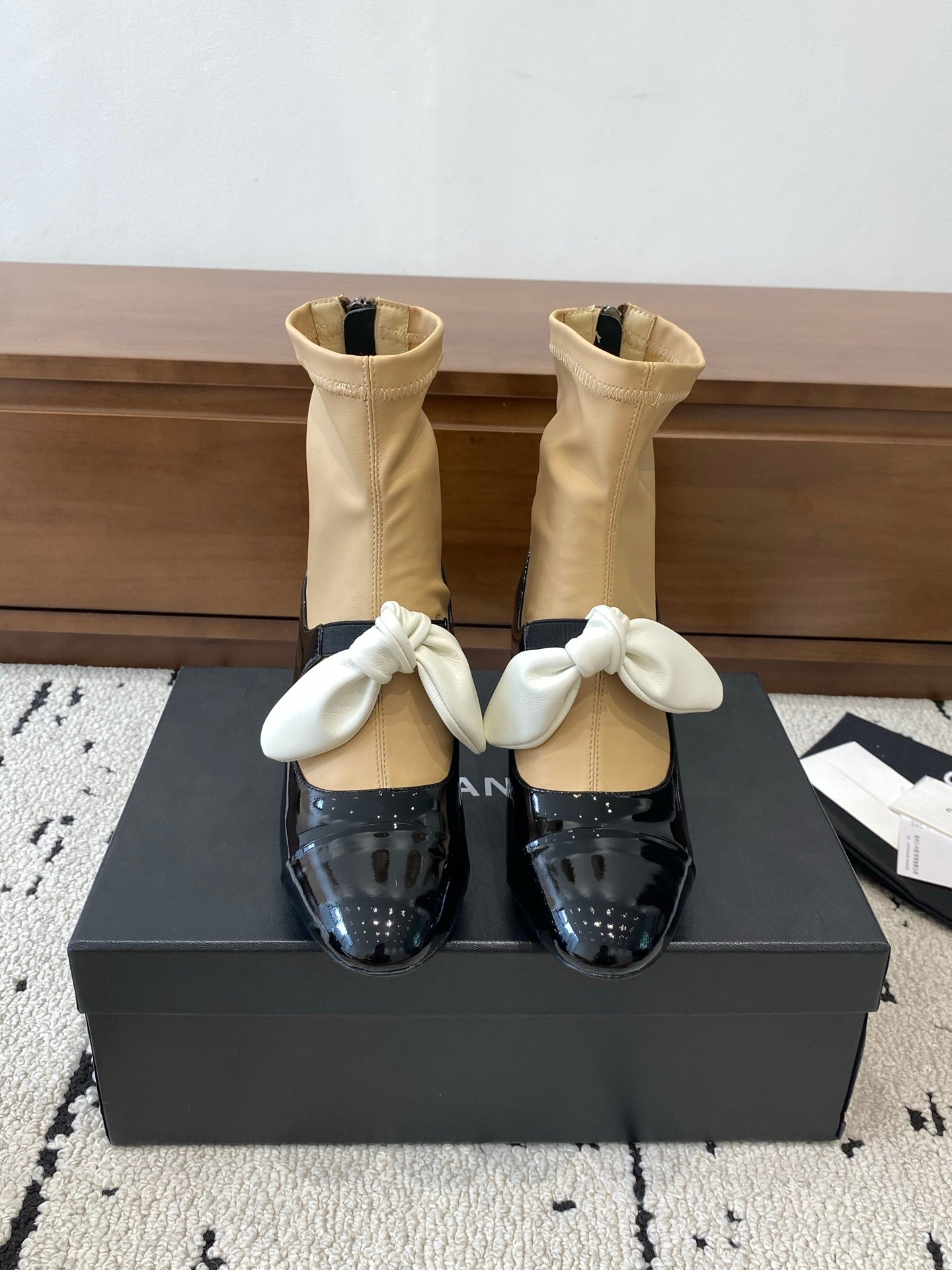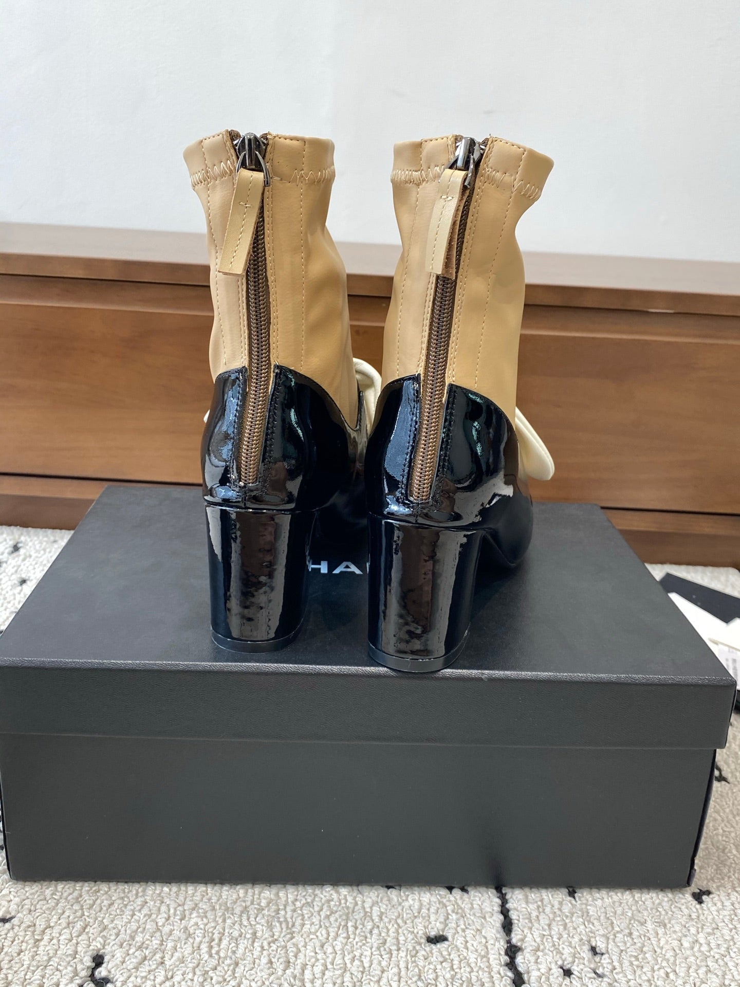 CC Big Ribbon Middle Boots Heel 50mm Black Beige Sheepskin Patent Leather 529279