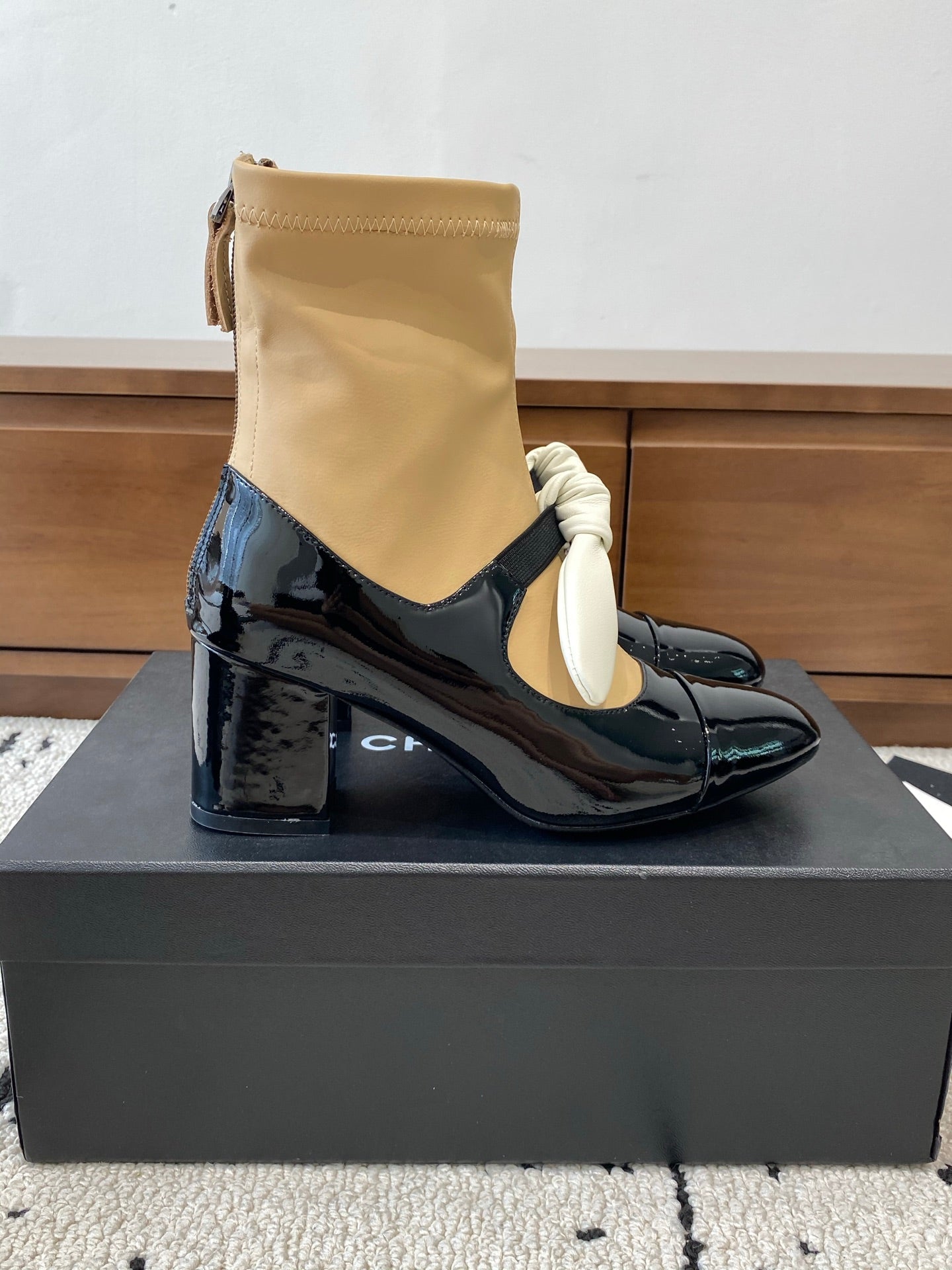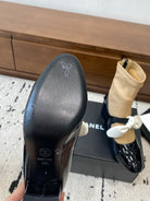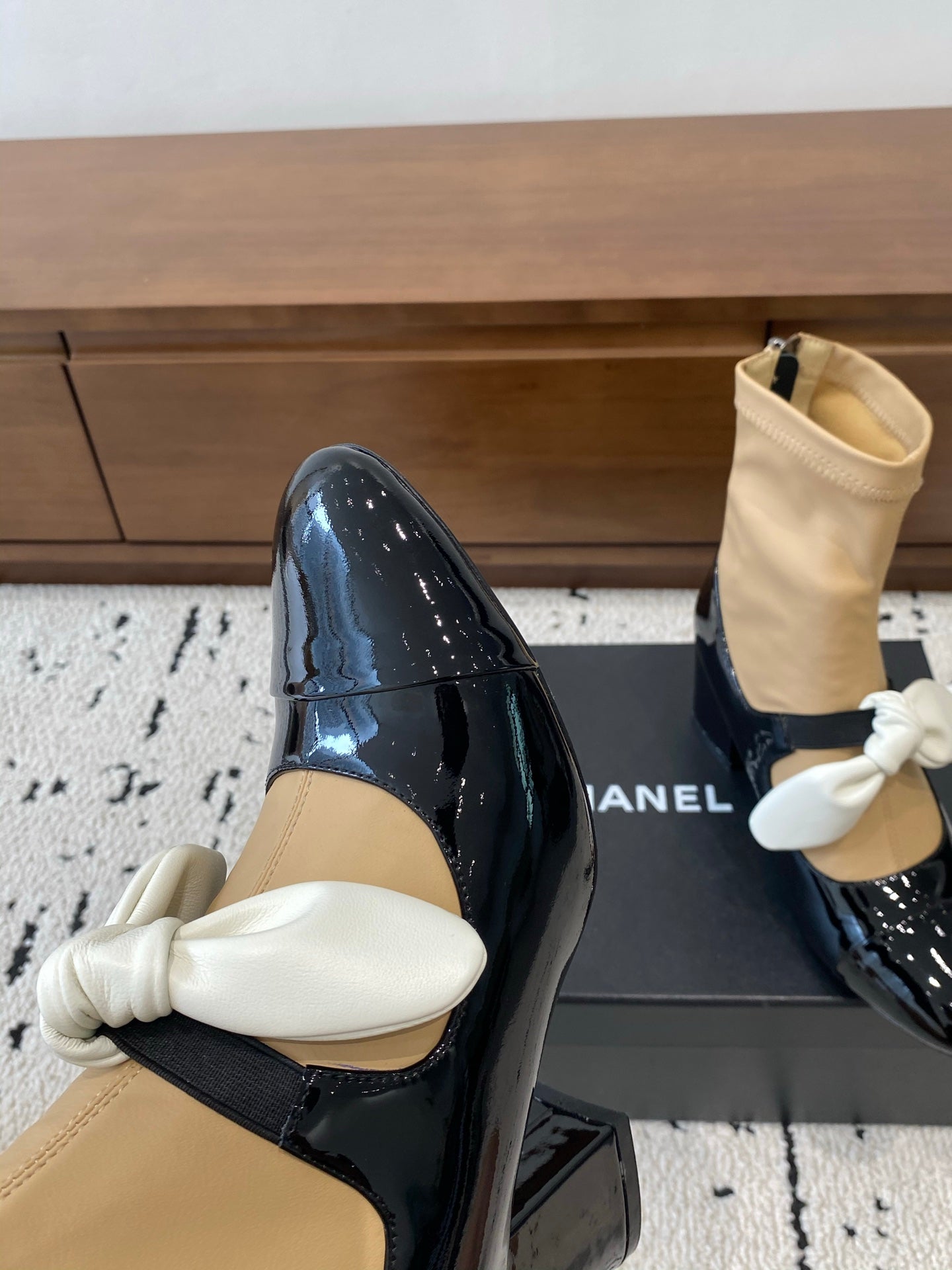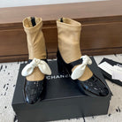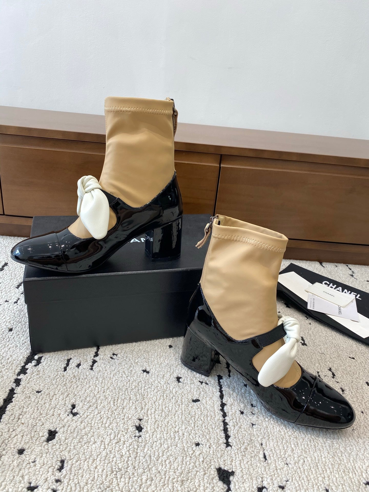 CC Big Ribbon Middle Boots Heel 50mm Black Beige Sheepskin Patent Leather 529279