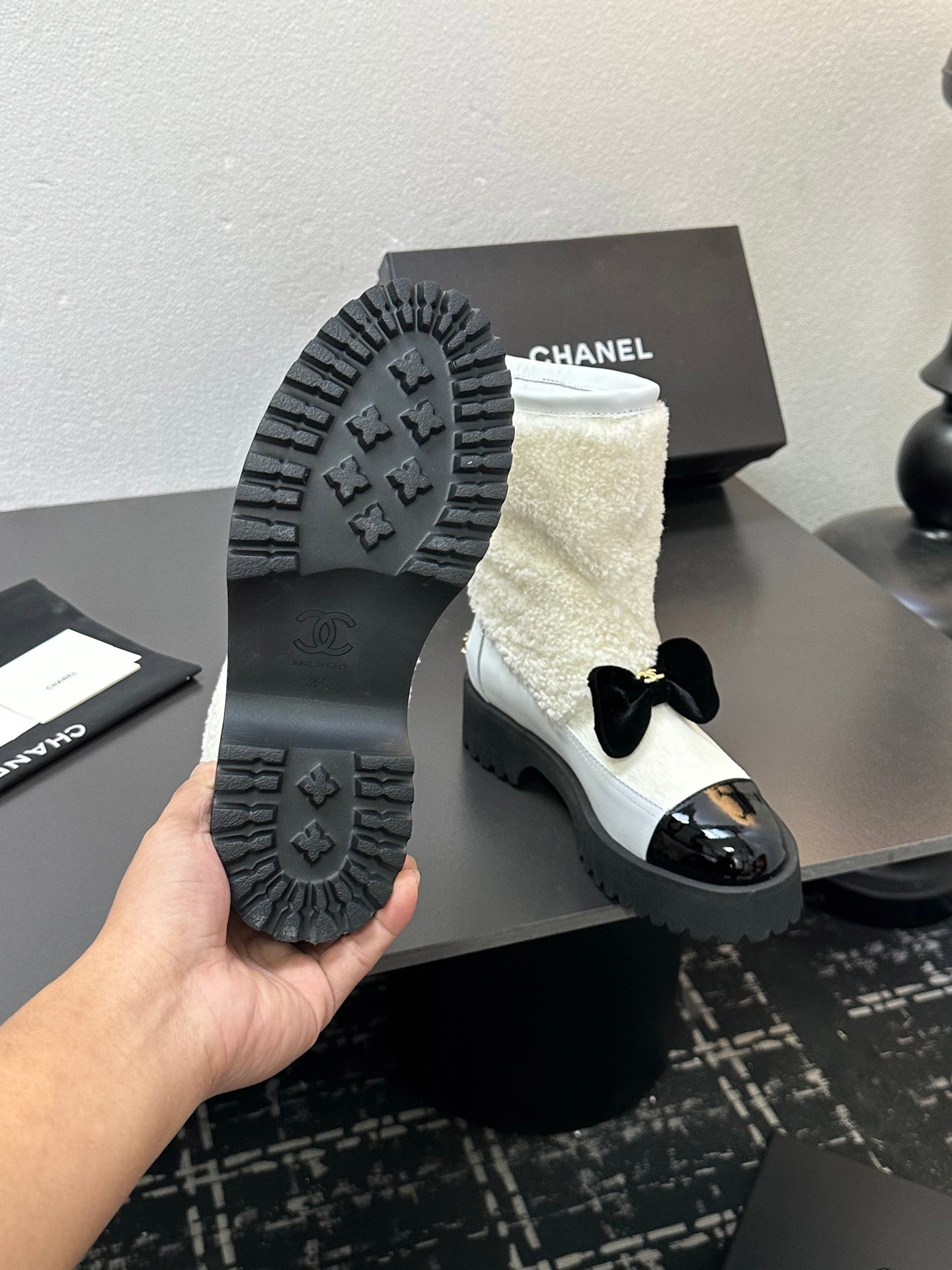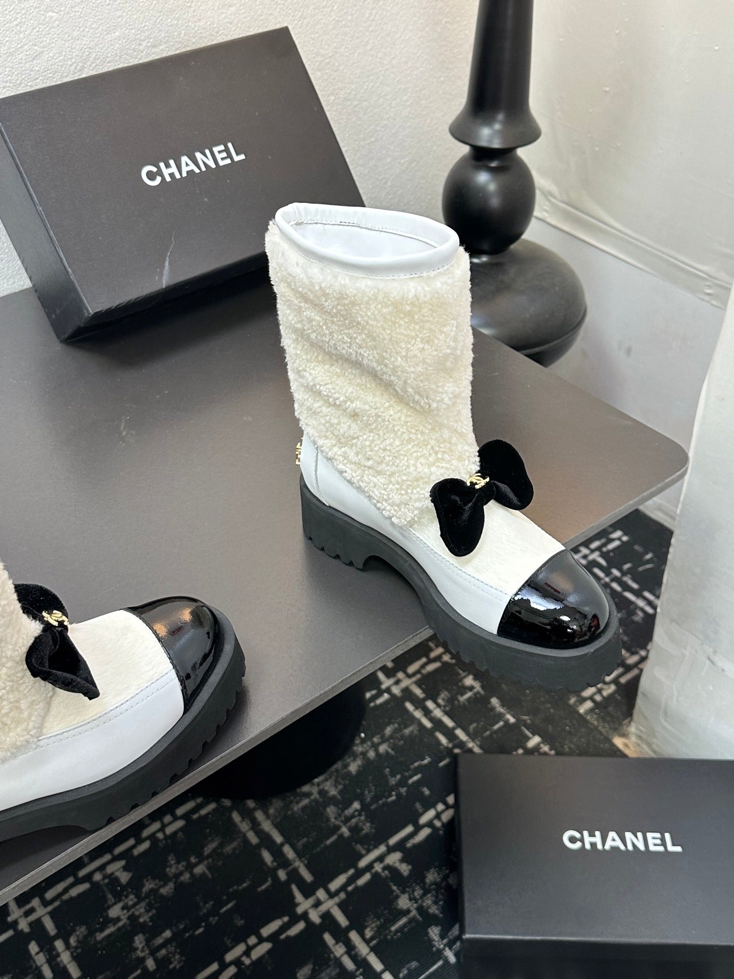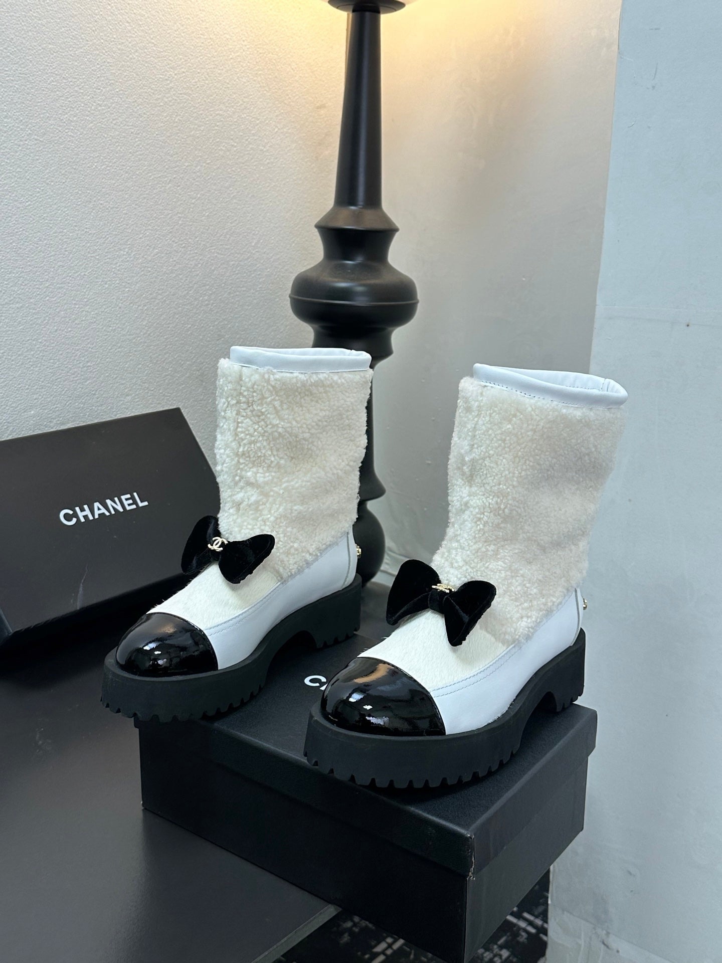 CC Coco Neige 2025/26 Low-cut Boots Black White Shearling Lambskin Patent Leather 529341