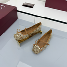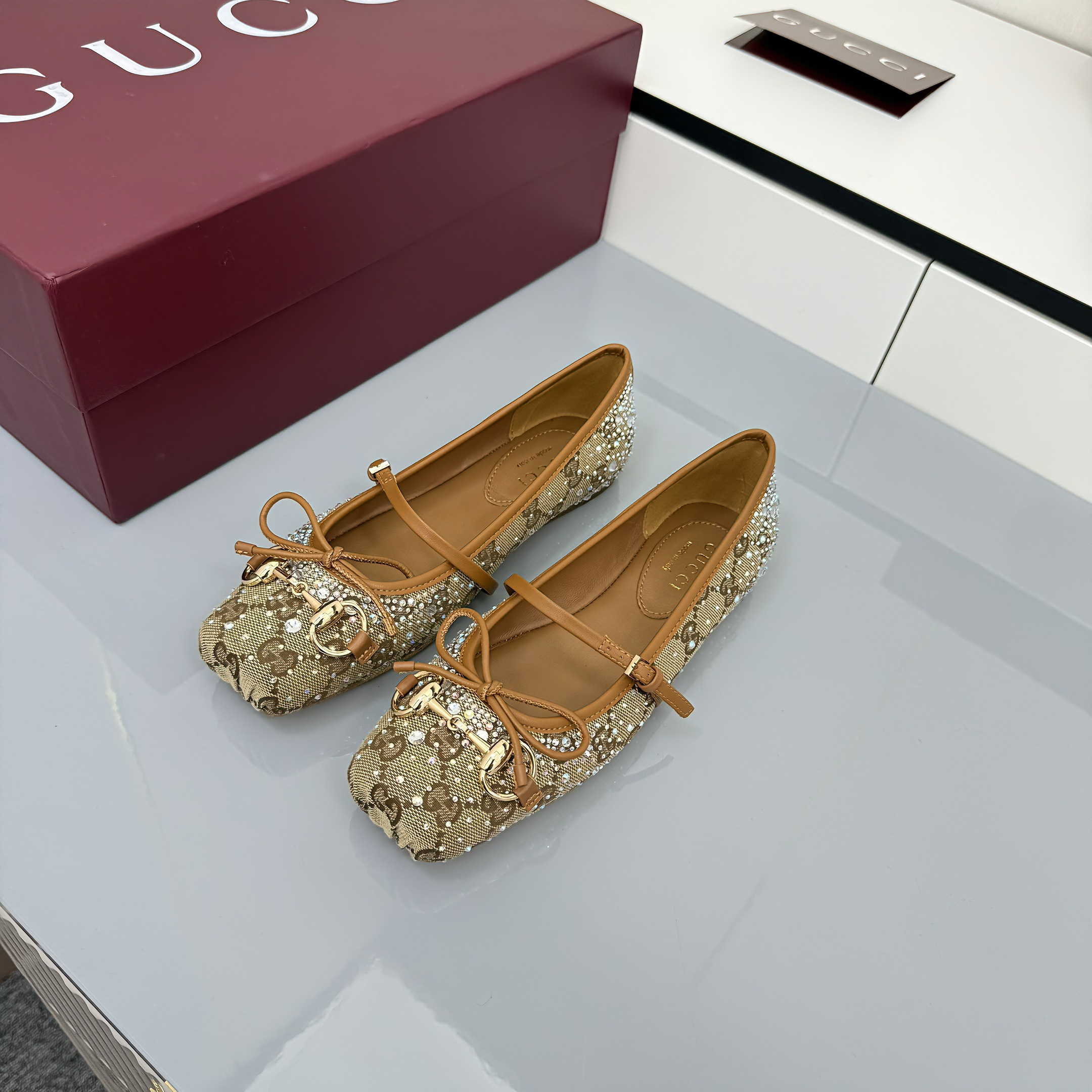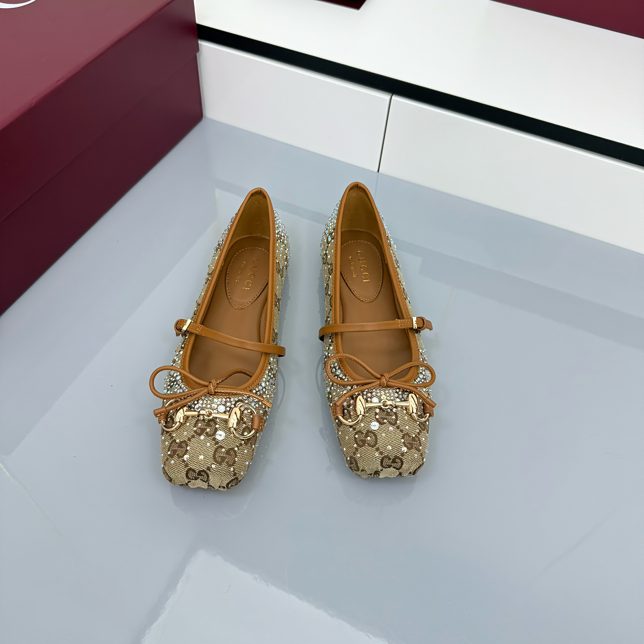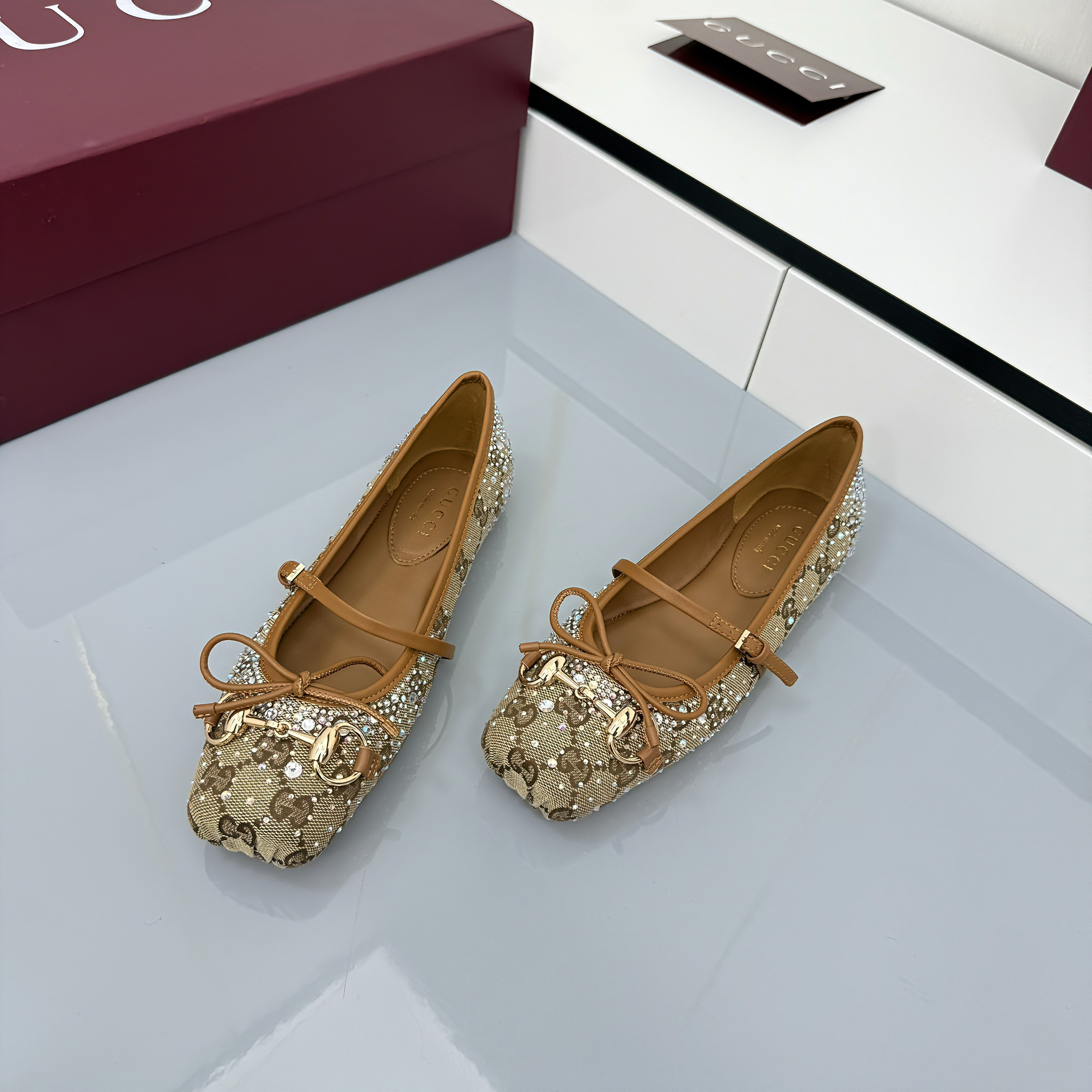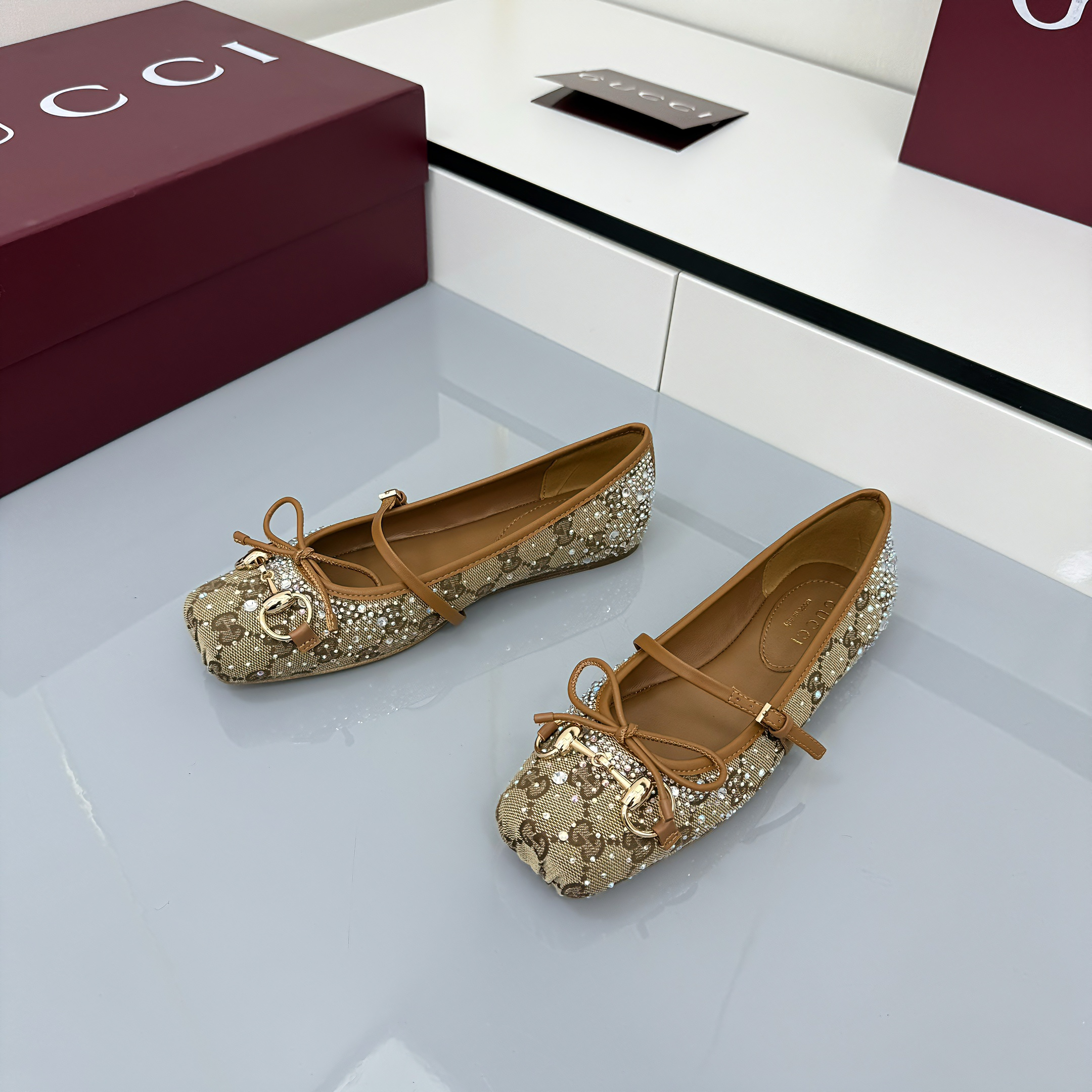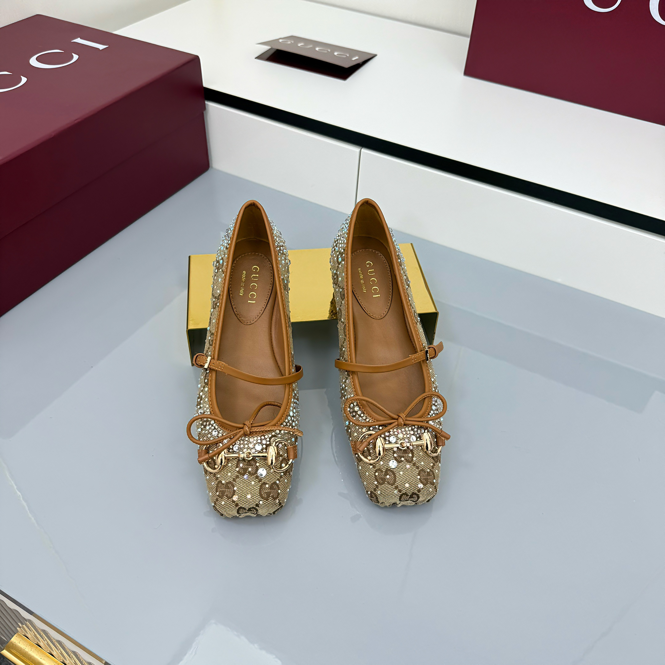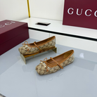 GG Women's Crystal Horsebit Ballet Flat Beige and Dark Brown Canvas 511209