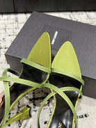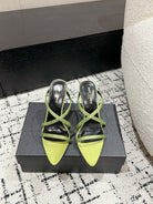 HIGH CRYSTAL STRAP SANDALS IN PEAR GREEN SILK