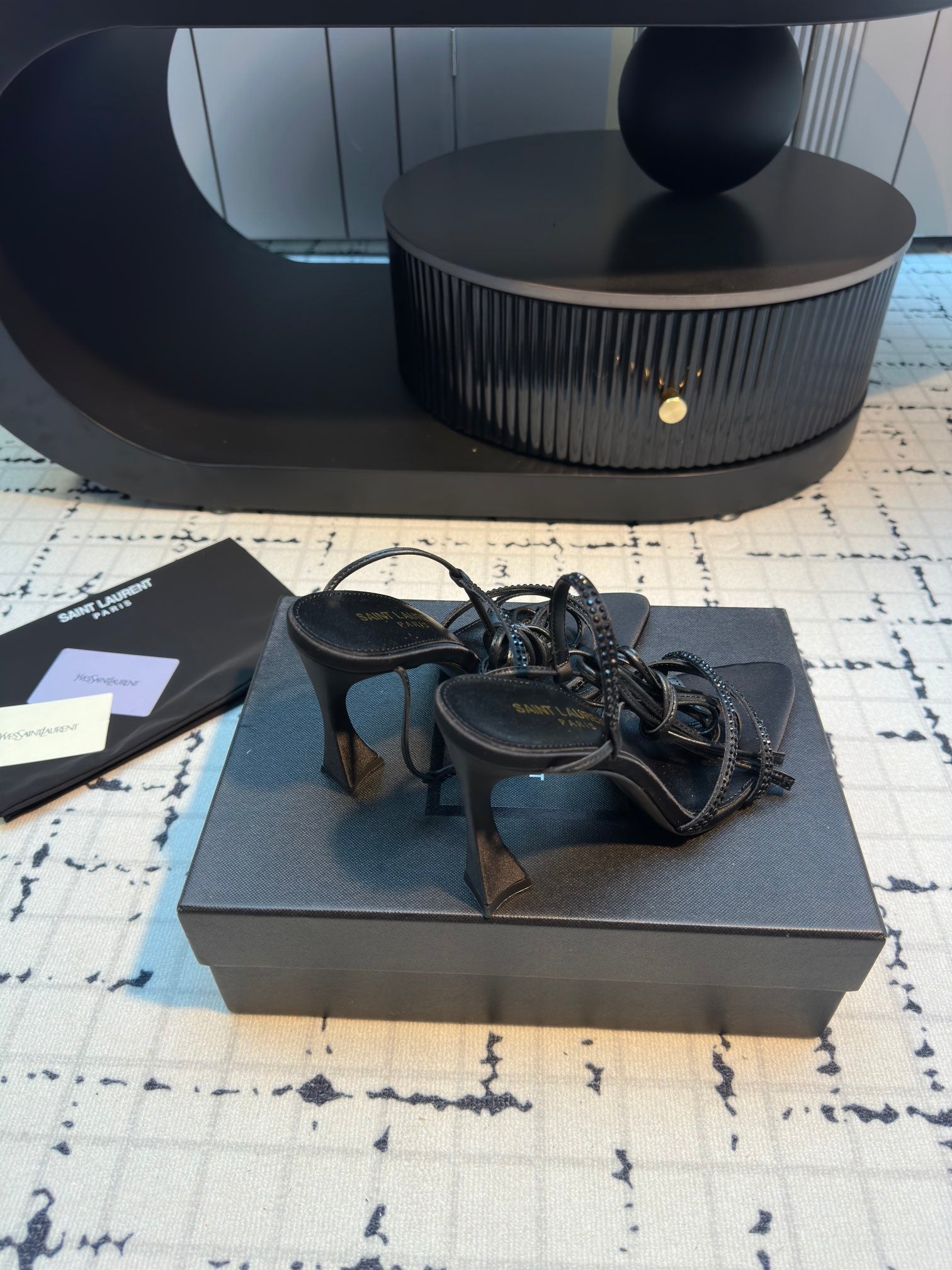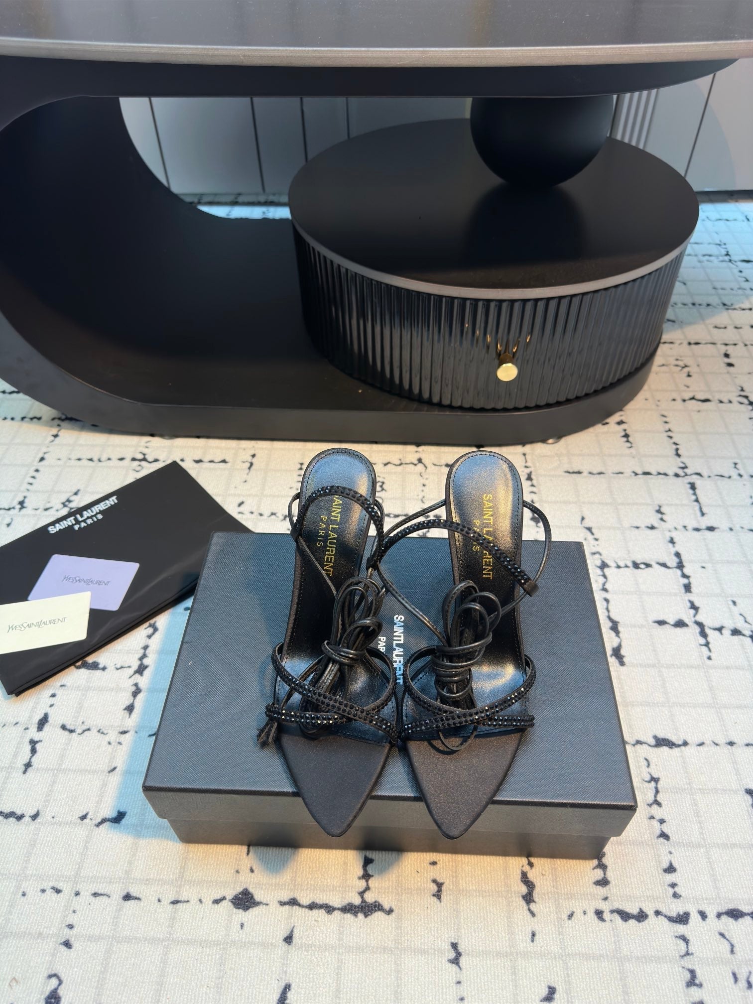 HIGH HEEL SANDALS WITH SHINY RHINESTONES STRAP IN BLACK SILK