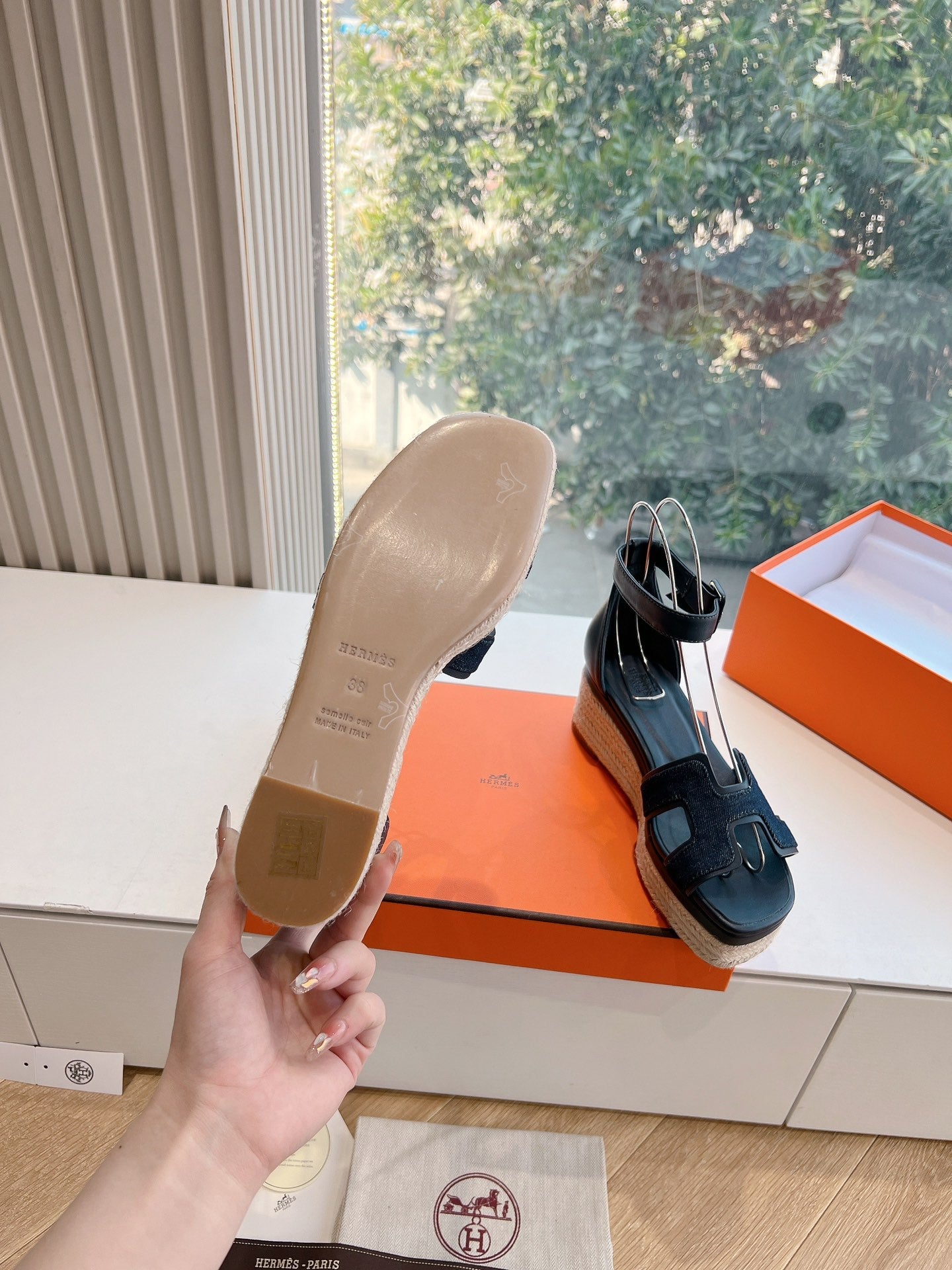 - Material: Denim and Goatskin, wedged rope heel