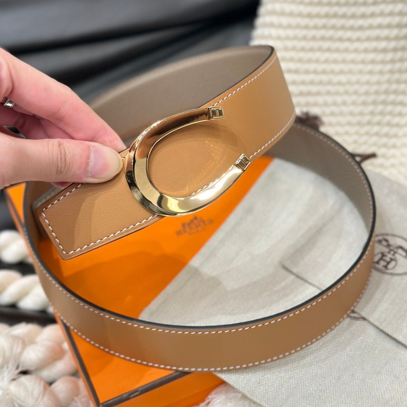 HM LUCK BELT GOLD BUCKLE & REVERSIBLE PEANUT BROWN LEATHER STRAP 38MM
