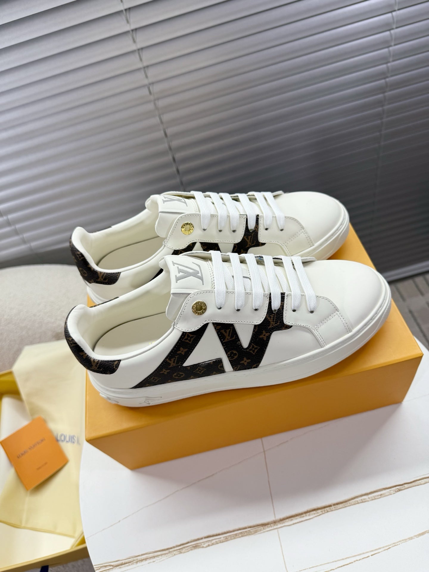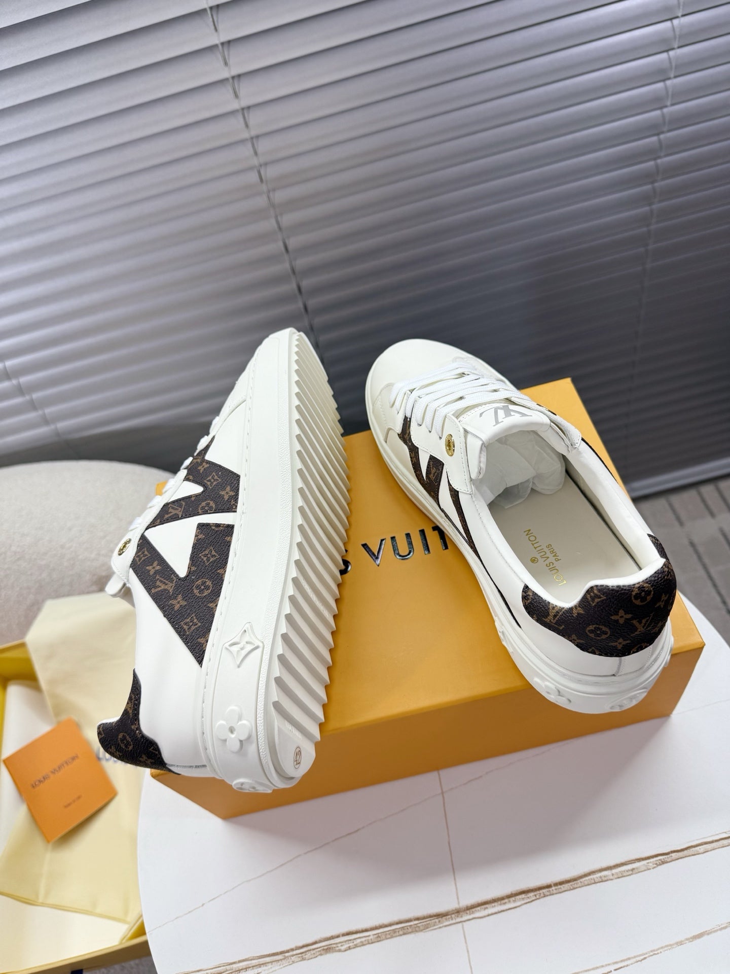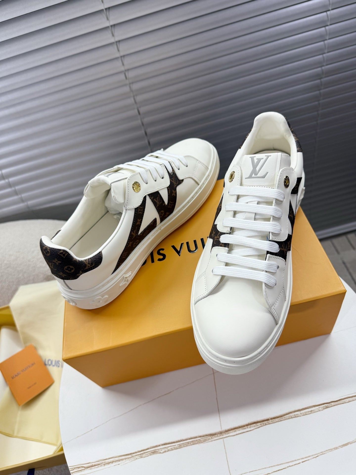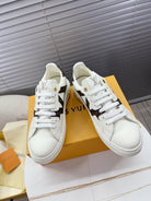 LV 1AIEFF Time Out Sneaker White Cowhide Brown Monogram Canvas 511748