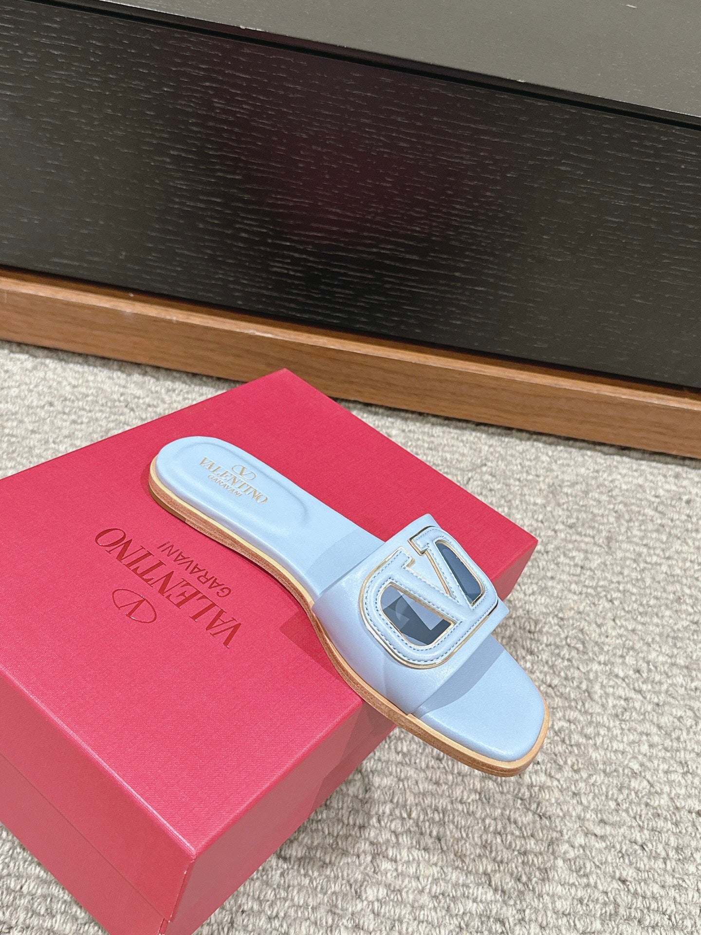 VLOGO CUT-OUT LIGHT BLUE CALFSKIN SLIDE SANDAL