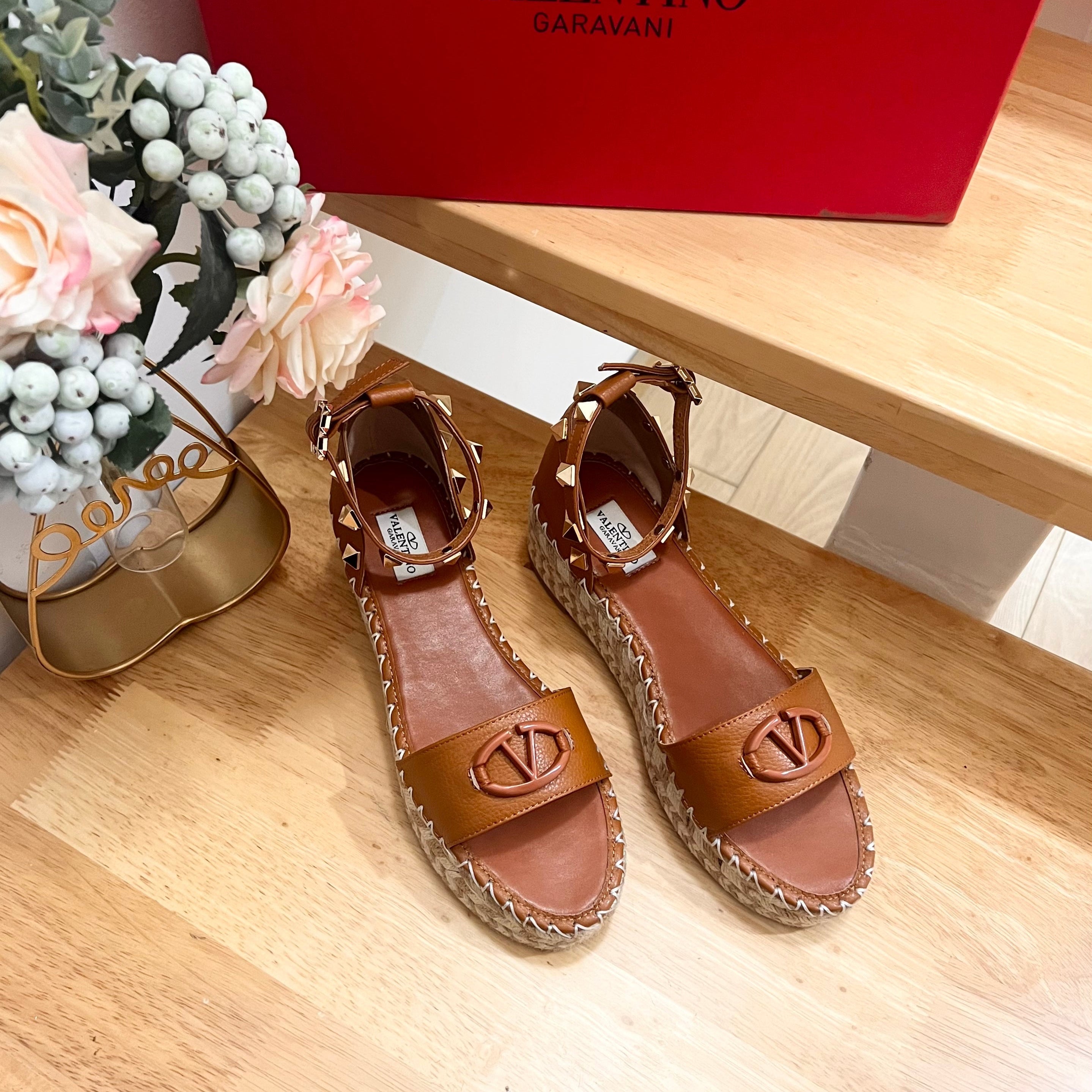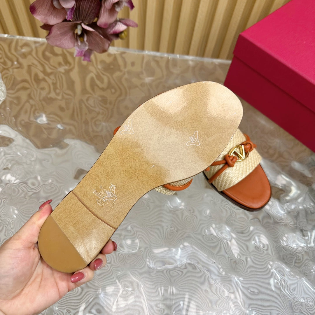 VLogo Raffia-Trimmed Leather Slides In Brown Orange Mix Beige Sedge Weaving Yarn And Lambskin 102815
